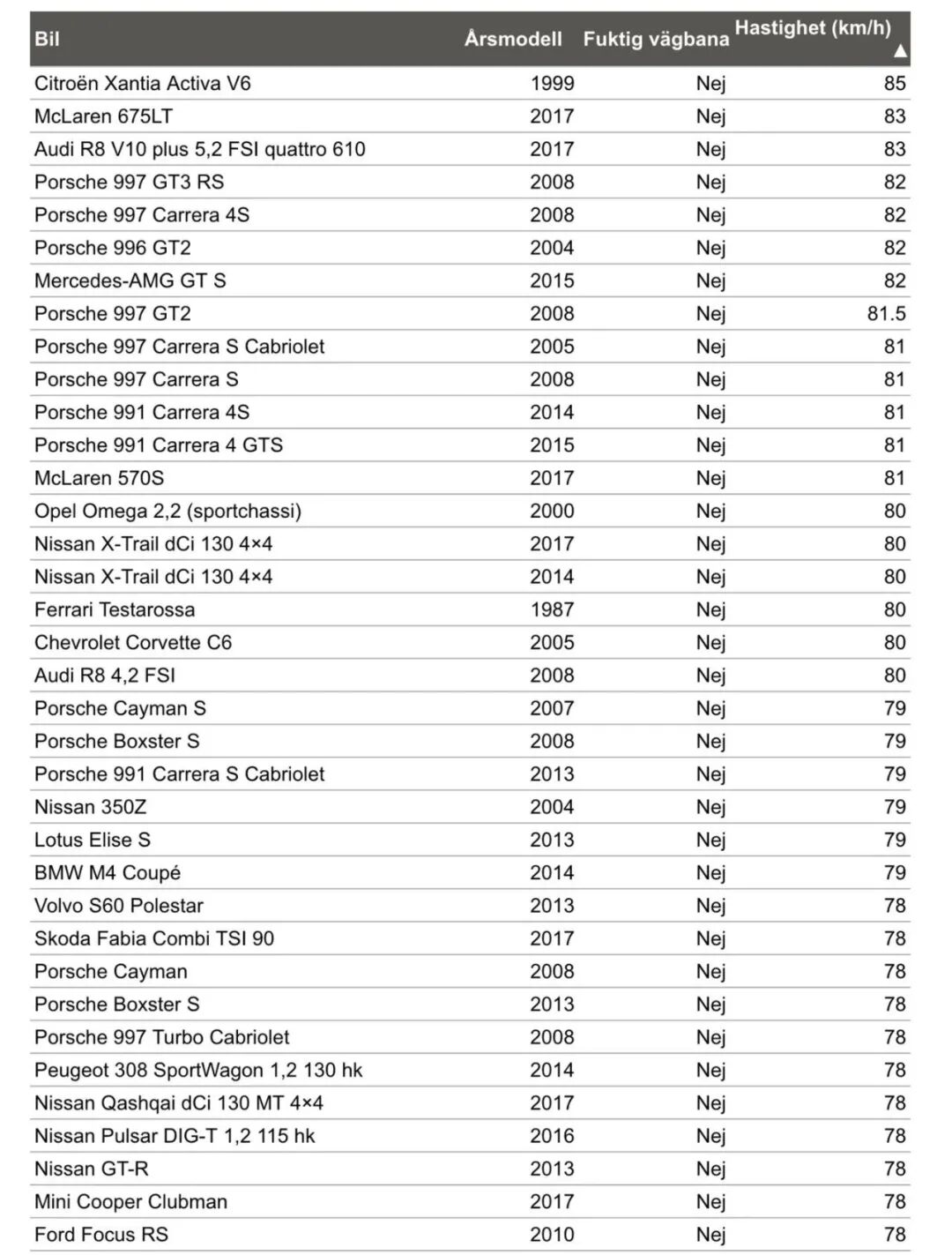 一直以来,在每每提到麋鹿测试,都会有“法系粉”跳出来说,PSA的车操控都很强,因为法系车的麋鹿成绩特别出色。当然,他们这样说自然是有依据的,因为在Teknikens Varld杂志的排行榜当中,排在第一的正是来自雪铁龙的Xantia Activa V6这款车,它的成绩甚至要比超跑迈凯伦675LT还要高。