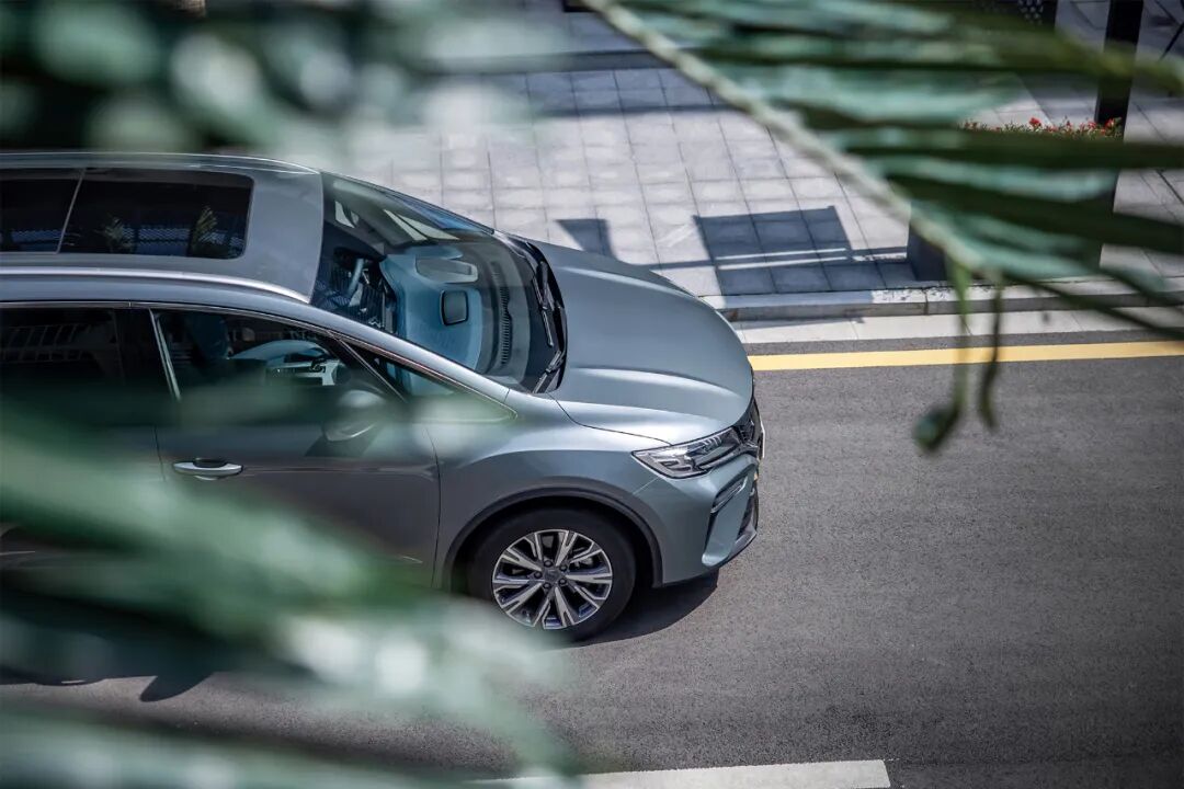 而车身侧面也是如此。车顶线条与车头的过渡非常平滑,前风挡的倾斜角度也比较大。高配车型上18寸的大轮圈让嘉际L的侧面显得尤为扁平,整车在观感上甚至更像是一台加长版的SUV,而非MPV。