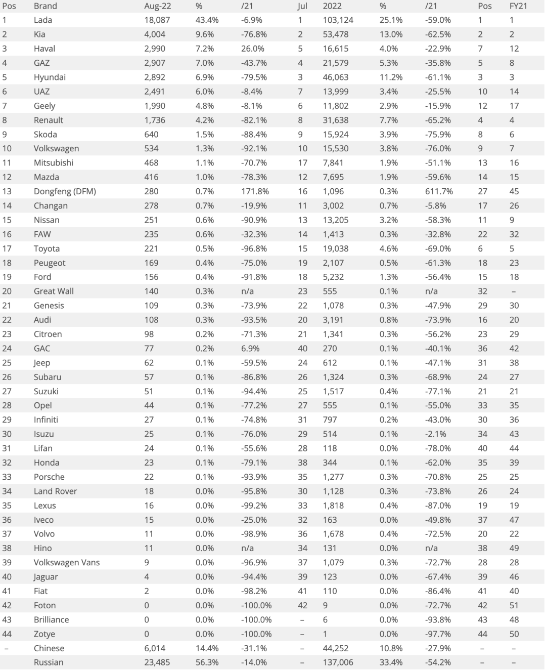 在具体销量方面,排名第一的依旧是本土廉价车品牌Lada拉达,18087辆的销量占据了43.4%的市场份额,同比下滑仅为6.9%。这也反映了,在国外品牌纷纷撤退的情况下,Lada这类“温饱型”廉价小车收到的影响其实并不大,因为本来它所瞄准的就是最为入门的客户群体,这部分群体本身与进口、合资车型的客户其实并不重叠。