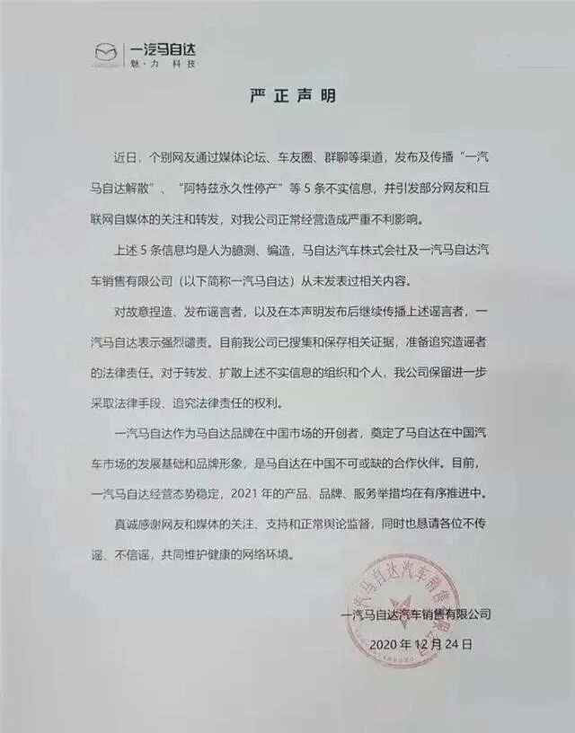 早在去年年底,一汽马自达就曾经被传出要解散的传闻,但是当时一汽方面反应迅速,立马发函澄清,称网上所传的“一汽马自达解散”以及“阿特兹停产”等消息均不实。