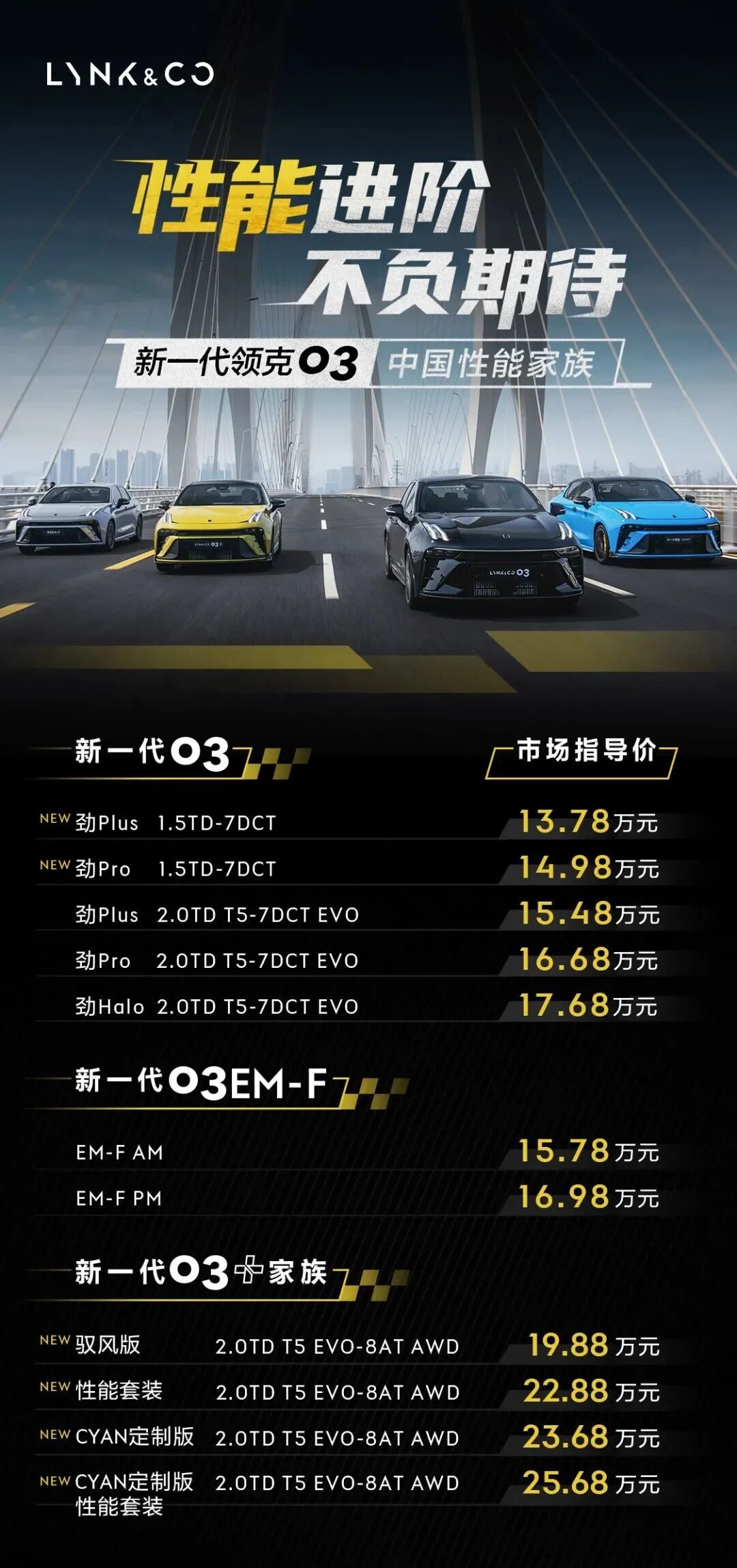 而新增的EM-F油电混合动力,则是为家用消费者提供了一个更加经济实惠的选择。更重要的是,在机械部分有了全方位的进步以后,新车的售价依旧维持在一个相当合理的区间——燃油版车型13.78-17.68万元,混动版车型15.78-16.98万元,性能版车型19.99-25.68万元。