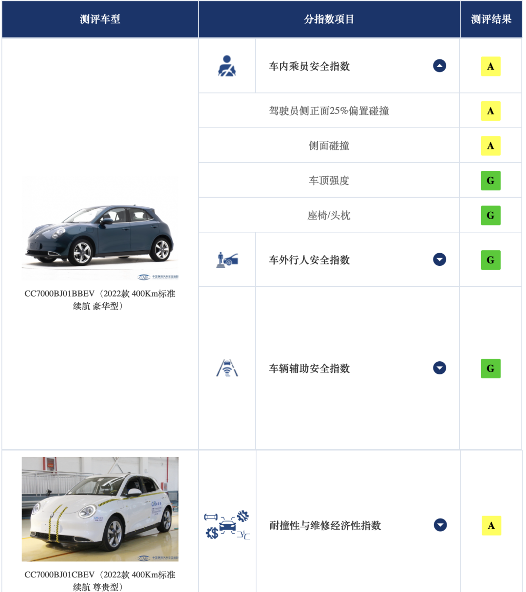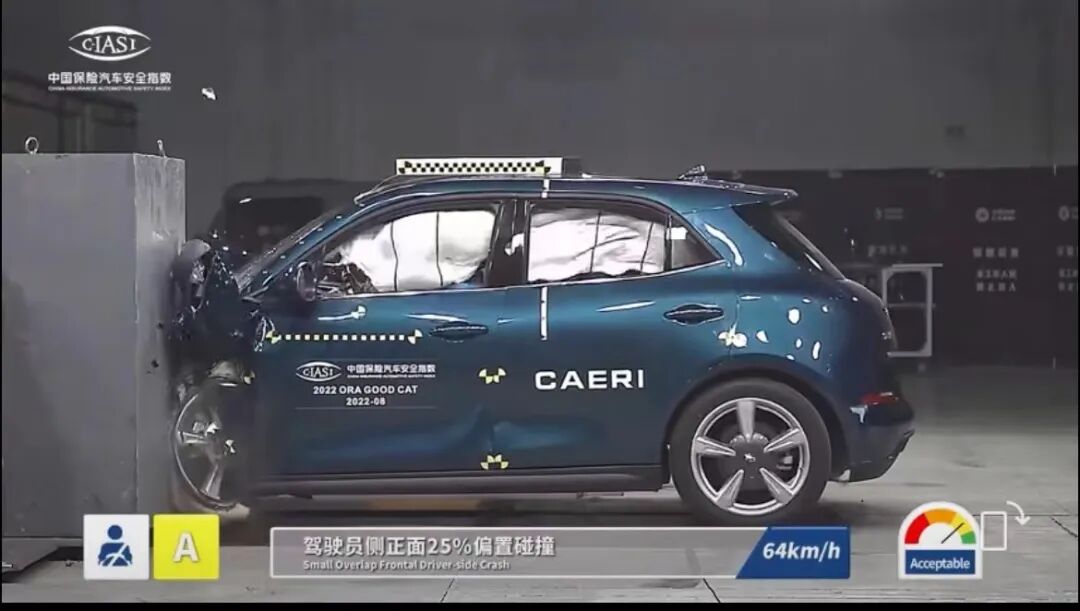 根据中保研公布的成绩,欧拉好猫是这次测试中,唯一一款未能在车内乘员安全上获得G(优秀)评价的车型,由于驾驶员侧25%偏置碰撞以及侧面碰撞的表现不佳,好猫的最终成绩只获得了A(良好)。