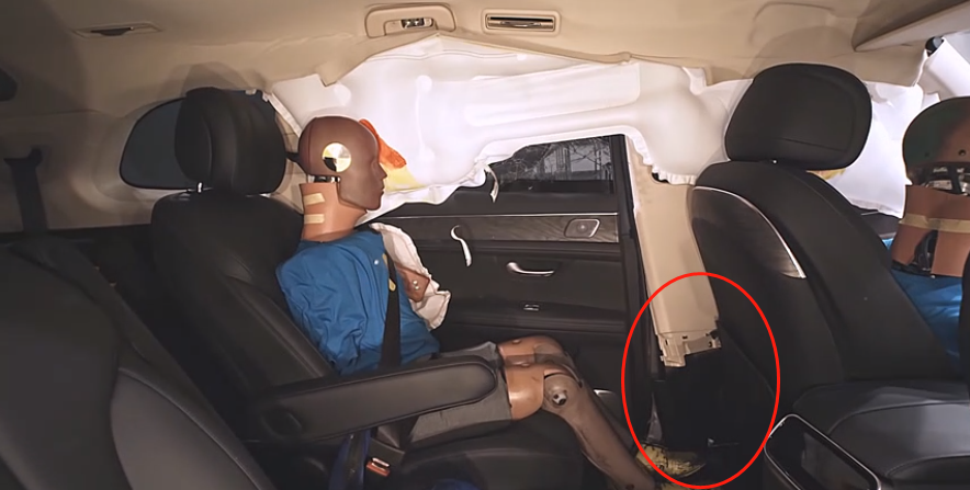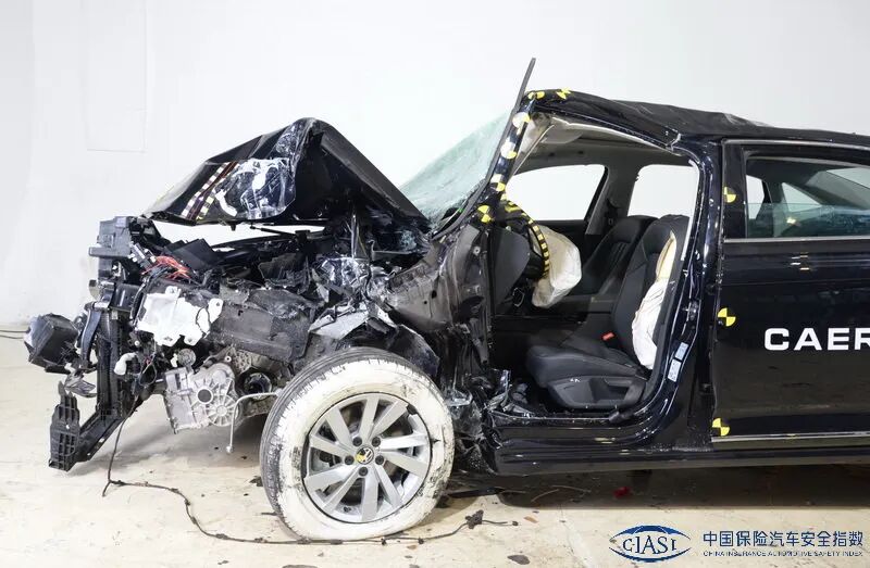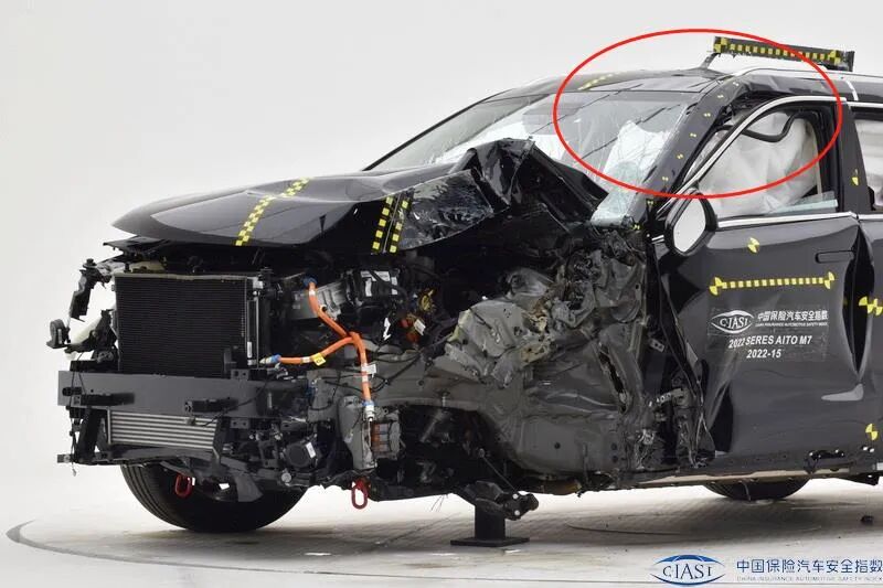 所幸,由于气囊的保护非常到位,A柱的弯折并没有影响到车内假人的“生命安全”,这也是为何问界M7在结构变形的情况下依旧能在偏置碰撞中获得高分。