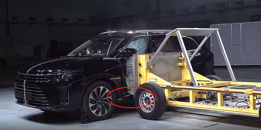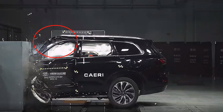 答案就出在它的25%偏置碰撞中的表现。与同台测试的领克09、理想L9、宝马X5等同样大尺寸的SUV不同,虽然问界M7的最终得分不低,但是在碰撞时A柱却出现了比较明显的弯折现象。