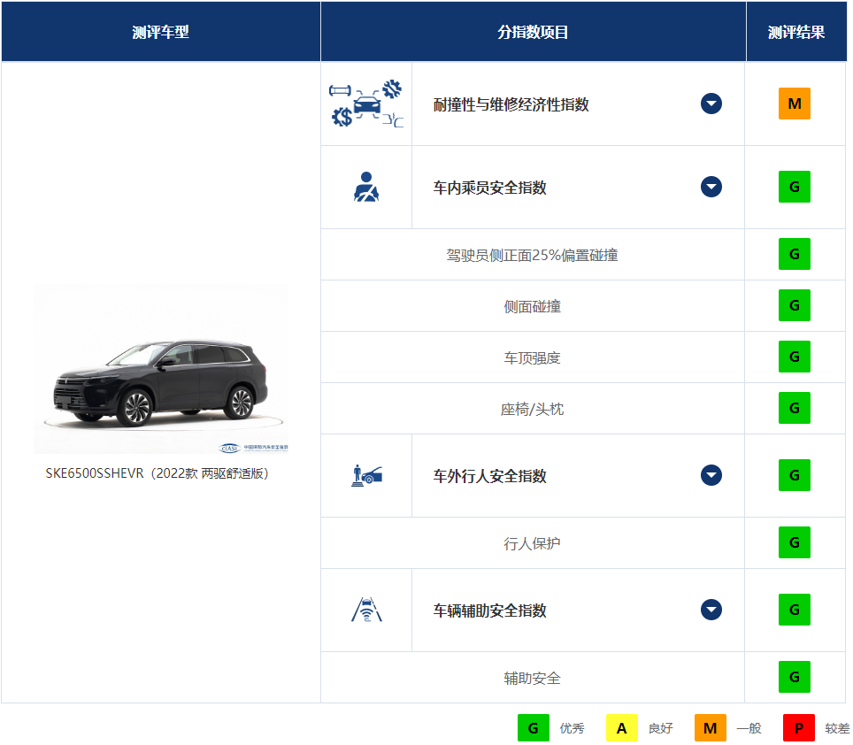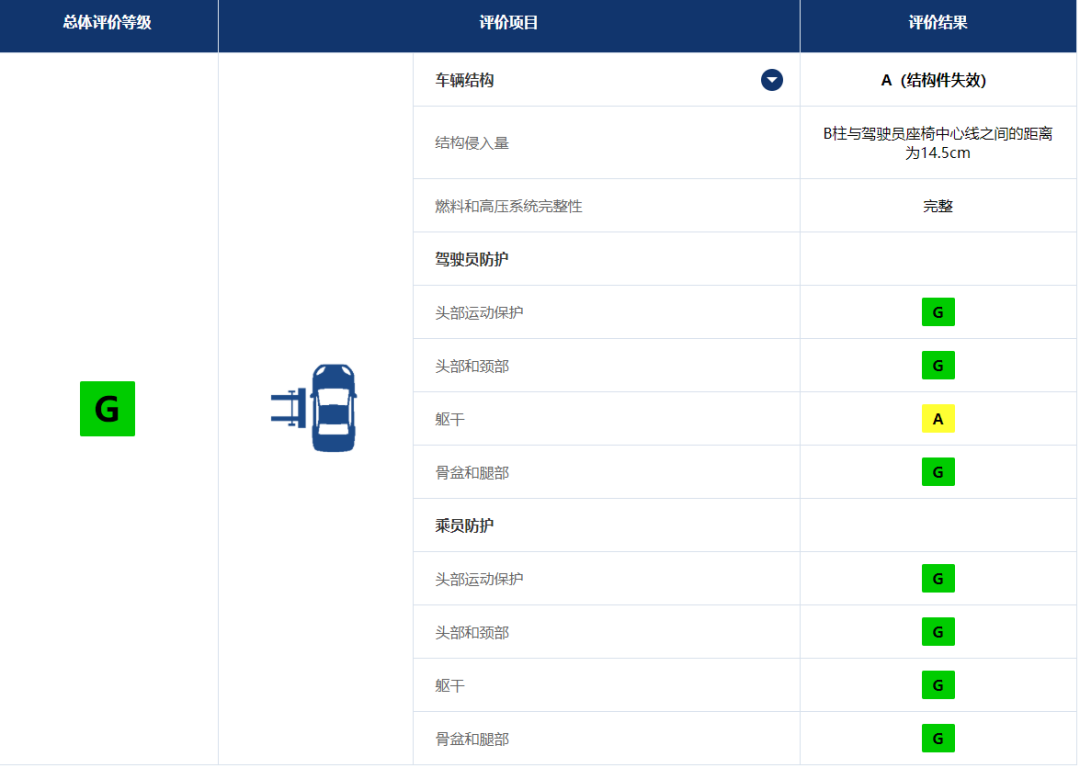 也正因如此,在驾驶员的躯干部位防护方面,问界M7也获得了唯一一个A(较好)的评价。但是在气囊、气帘的有效保护之下,侧面碰撞的其它细分选项得分也都不低。