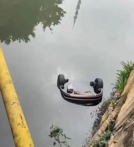 从后续附近居民拍摄的照片中我们则是可以看到这台可怜的福睿斯已经车底朝上,躺在了河边,所幸河水并不深,因此后轮以及车尾保险杠仍露出在水面之上,同时车辆周边已经漂浮着一些疑似是汽油或机油的油渍。
