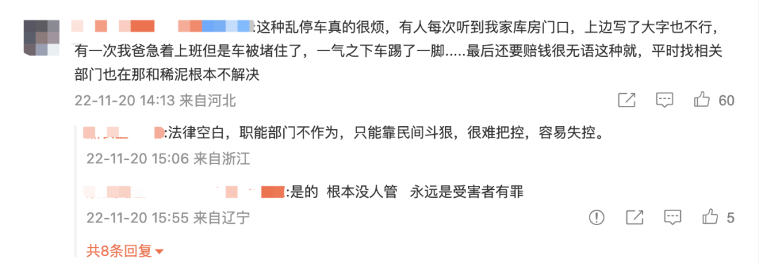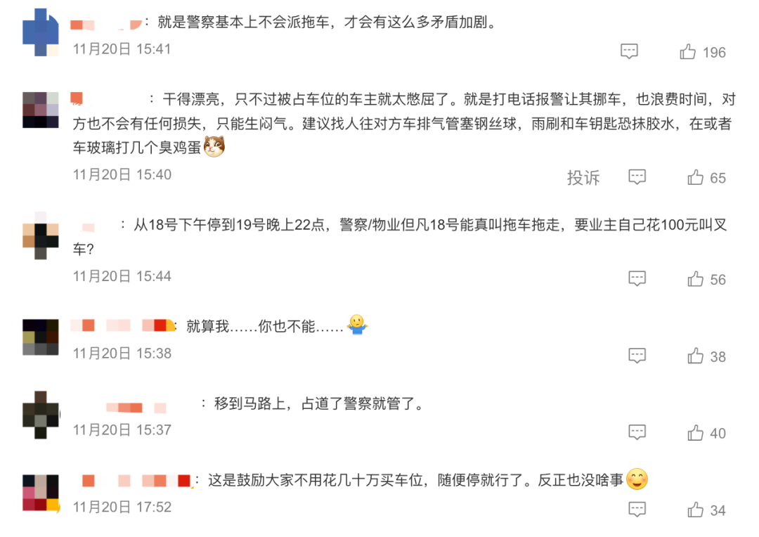 有遇到过类似情况的网友表示,面对自己车位被占,自己作为受害者其实相当被动,一方面法律规定了我们不能对对方的车辆造成损伤,另一方面对方也无需要为自己的侵占行为付出法律代价,正因如此才会有那么多的人肆无忌惮地霸占他人车位。