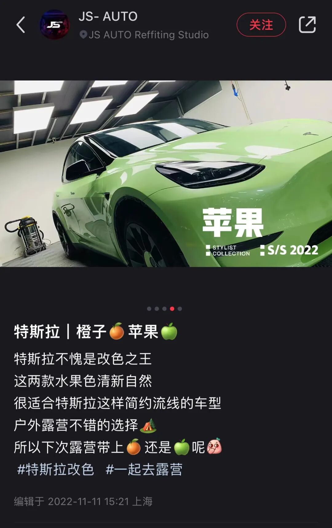 但是在翻看这家改装店发布的推广图片时,我发现与大家想当然的不一样,特斯拉作为市面上贴改色膜比例最高的车型之一,其实是这家高端改装店一个相当重要的客户来源。店里也不仅仅是只有豪车,甚至我还看到有大众高尔夫八代GTI到店内改“痛车”的,我作为同款车主,也是有些许“受宠若惊”。