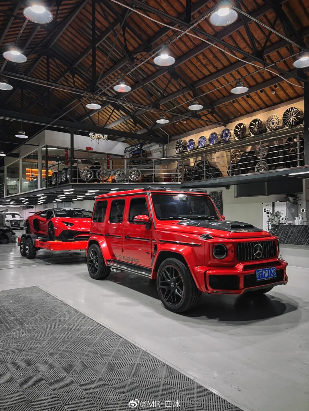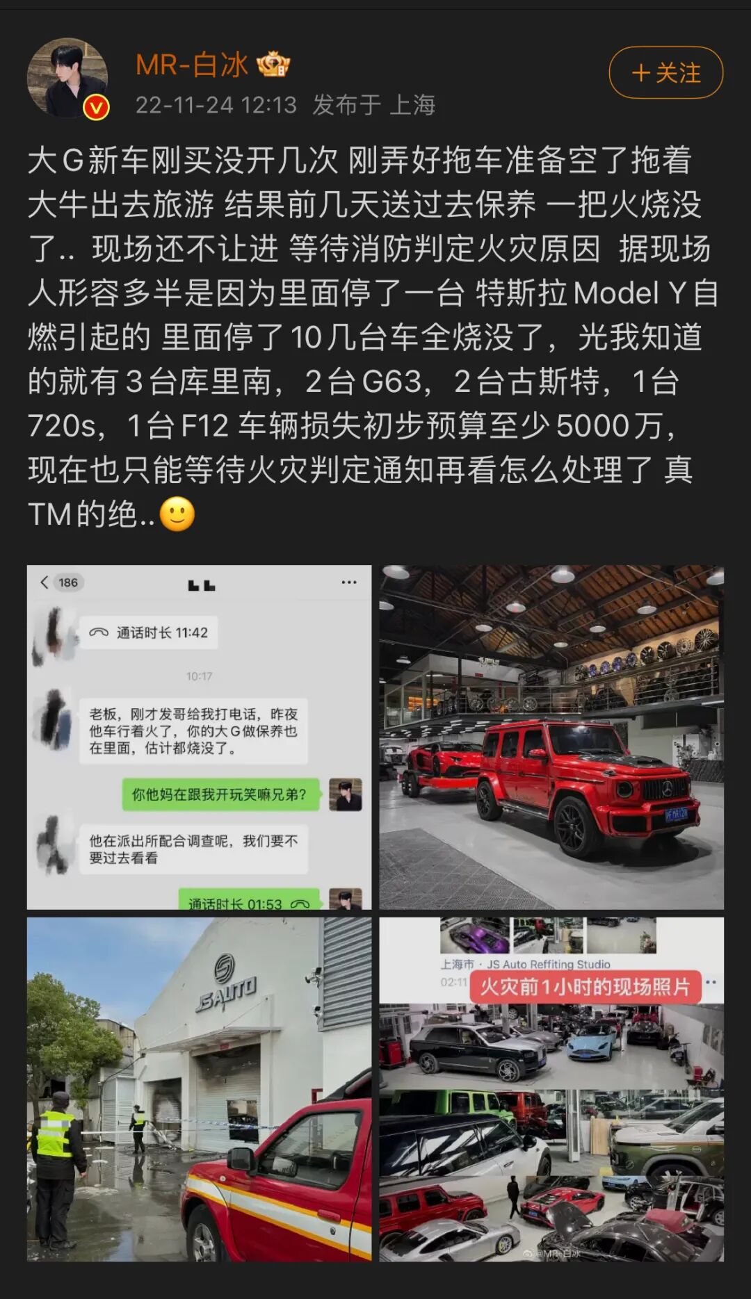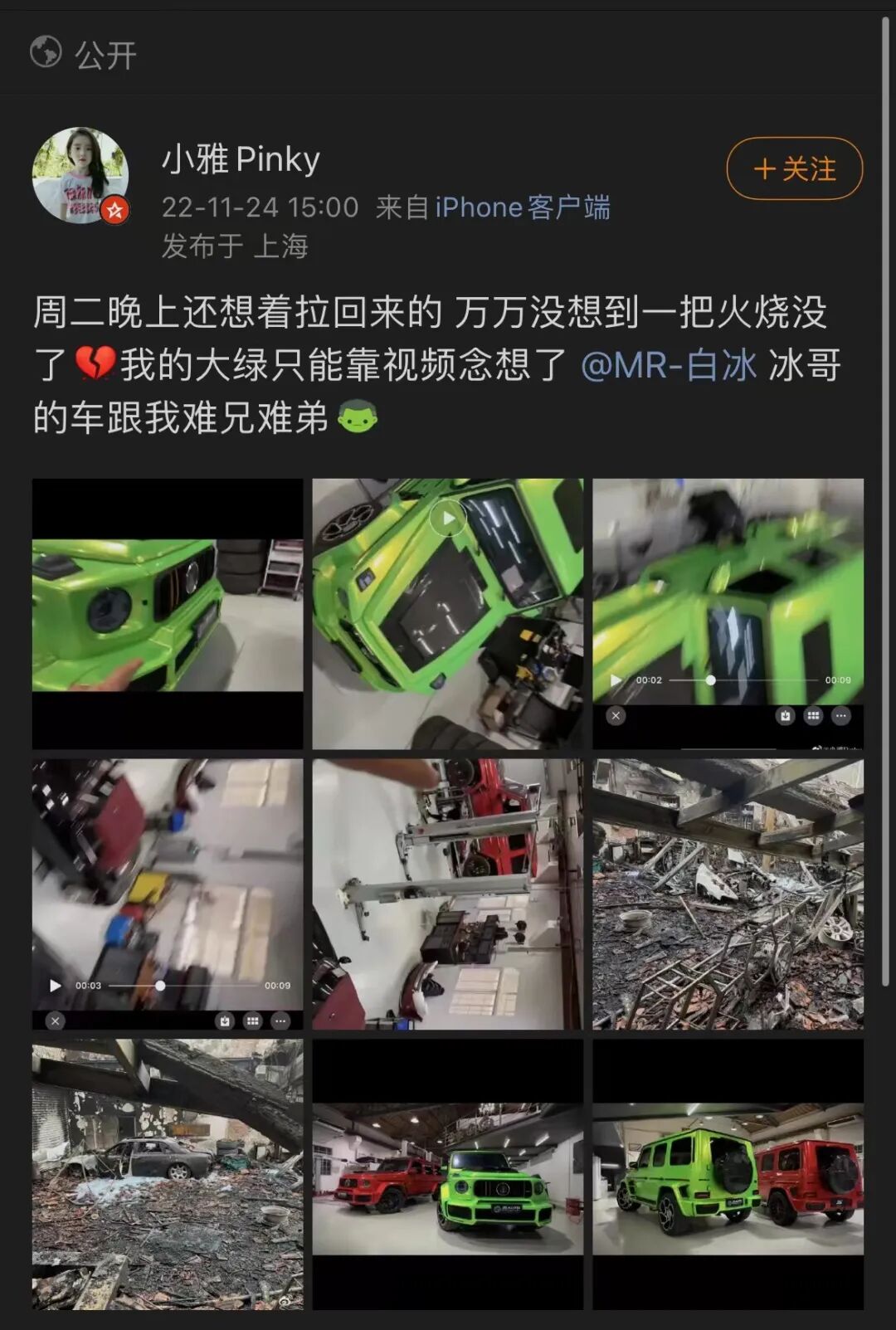 从这位博主发布的微博中可以看到,与她这台骚绿色大G同时在车房施工的,还有一台红色的大G,而很不幸,这台车同样也被付之一炬。而它的主人则是@MR-白冰 ,这位在微博、抖音等多个平台都拥有众多粉丝的博主,是一位名副其实的网红,平时拍摄的关于汽车以及美食探店的内容也都颇受欢迎。