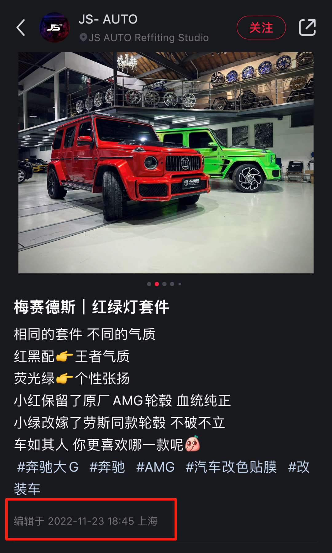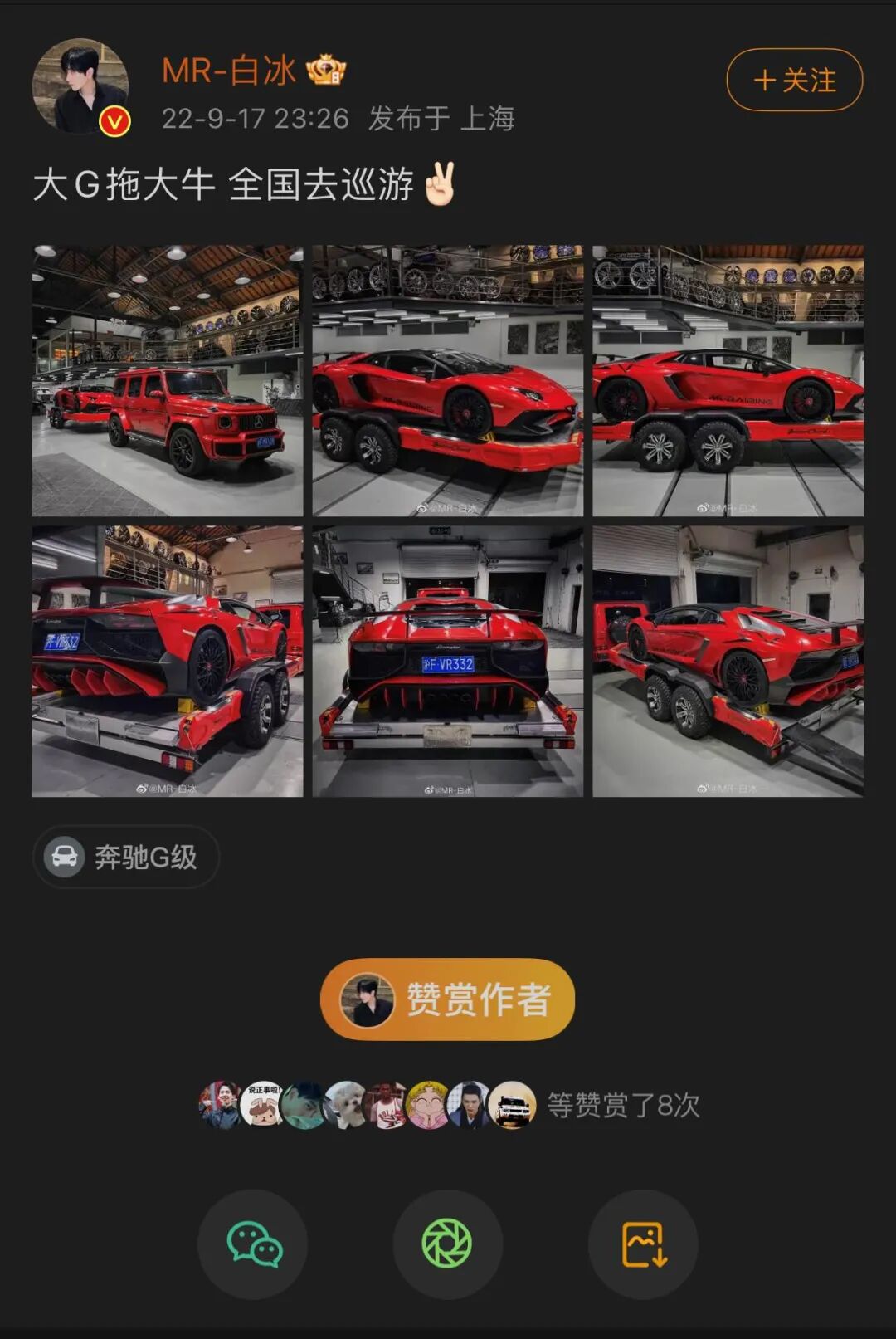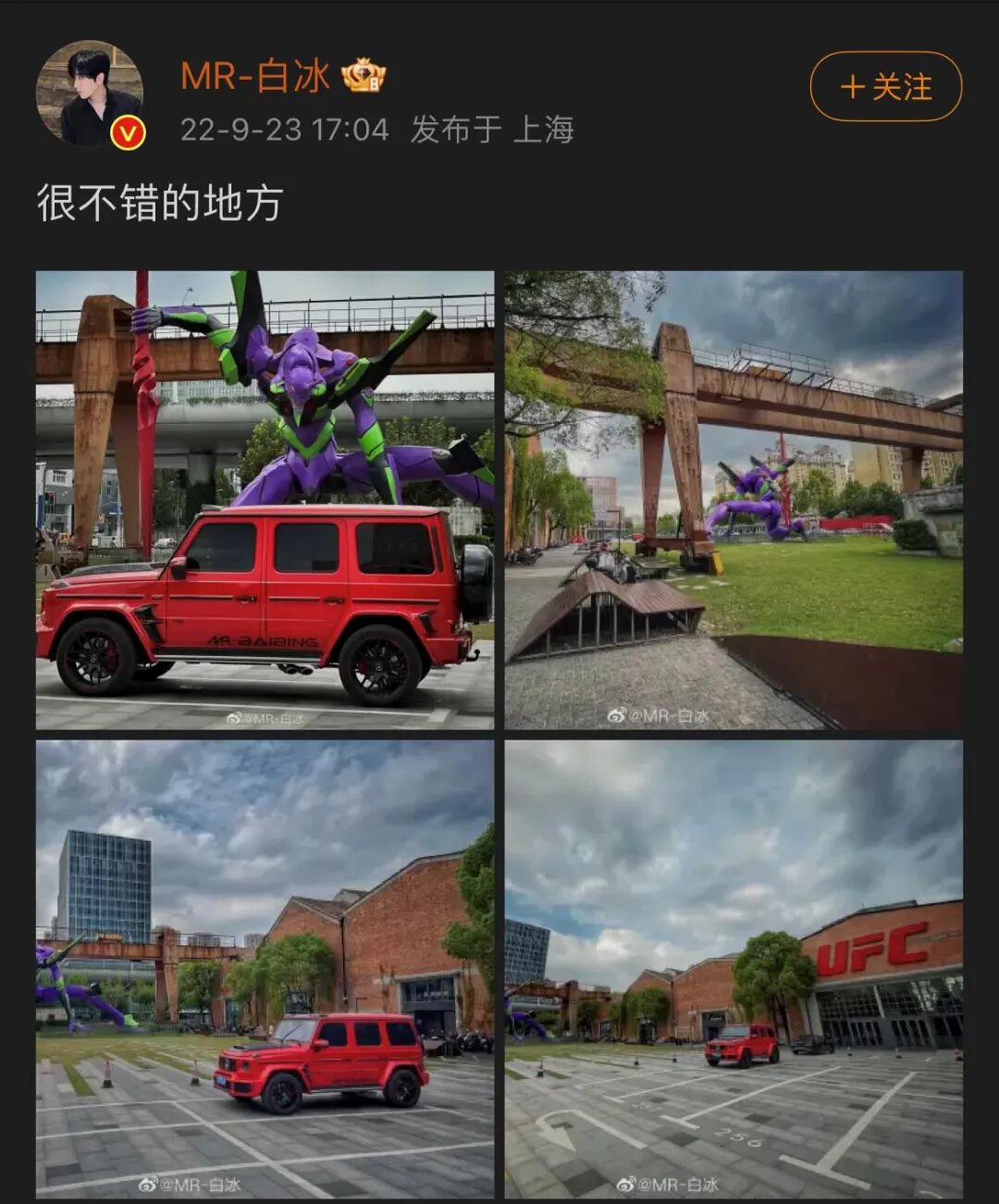 从这位博主发布的微博中可以看到,与她这台骚绿色大G同时在车房施工的,还有一台红色的大G,而很不幸,这台车同样也被付之一炬。而它的主人则是@MR-白冰 ,这位在微博、抖音等多个平台都拥有众多粉丝的博主,是一位名副其实的网红,平时拍摄的关于汽车以及美食探店的内容也都颇受欢迎。