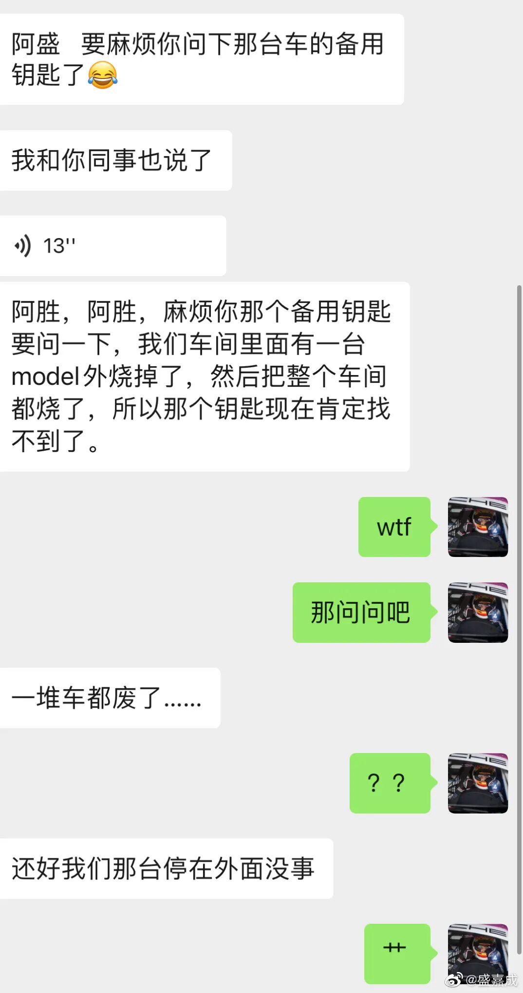 而根据疑似是店家的人与这两位博主交流的聊天记录中我们可以看到,店家的人都表示这场火灾引发的原因是车间里面有一台特斯拉Model Y发生了自燃,进而导致整个车库被烧毁。