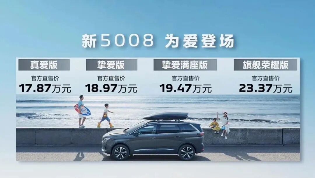 新款5008官方指导价为17.87-23.37万元,可能你会觉得奇怪,5008的老款车型起售价也就18.77万元,虽然顶配车型的价格确实是下降了不少,但是貌似也没啥好惊喜的啊?那你就错了。因为,2023款的5008取消了以往拉低入门售价的1.6T车型,起步即是1.8T版本,而1.8T车型以往的起售价可是被定在了21.97万元,换言之,实际上5008借着这次改款,直接进行了一次幅度近五万元的官降。