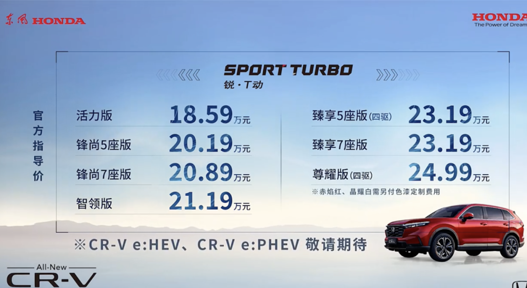 东风本田第六代CR-V目前全系指导价为18.59-24.99万元,所有车型均配备1.5T+CVT的动力总成,在配置则是上一共分为活力、风尚、智领、臻享、尊耀五大版本,同时臻享与风尚两个版本都分别提供七座版车型。