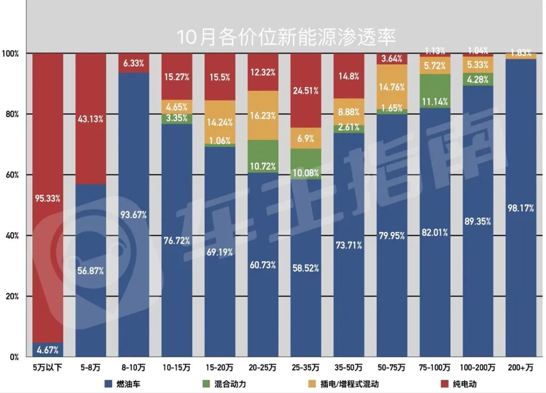 就拿10月份的销量作为例子,当我们把新能源车的渗透率拆分成不同价位来看的话,就能发现一个奇怪的现象:作为最主流的价格区间,8-20万的价位的新能源渗透率其实要远比我们想象中的低。而8万元以下,以及20-50万这两个比较极端的价位,反而是新能源车大放异彩的领域。
