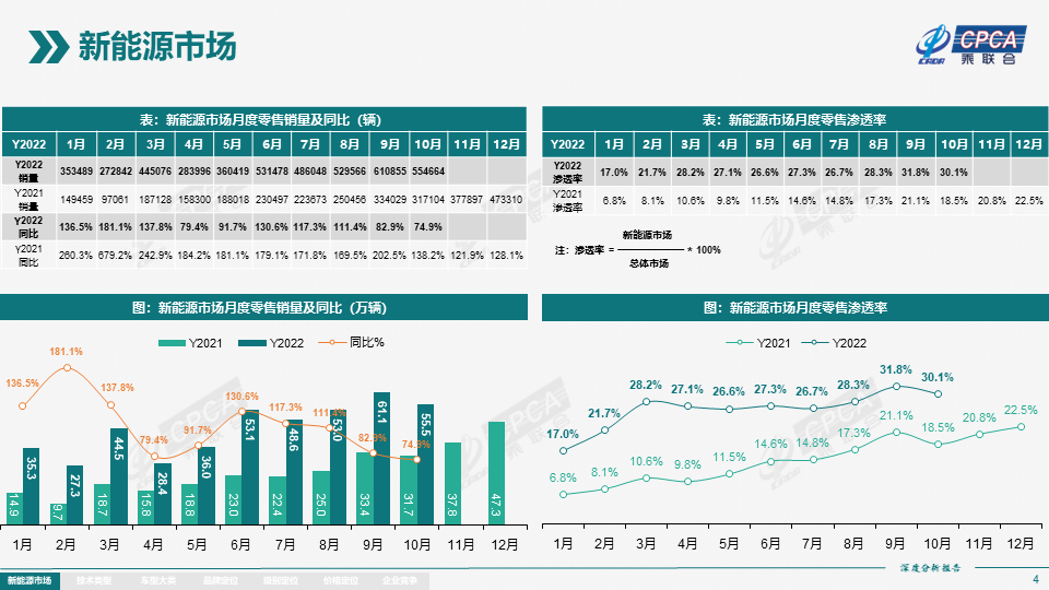 而在10月份,根据乘联会统计的数据,国内新能源车销售占乘用车市场总体销量的30.1%,渗透率继9月份的31.8%以后,再度突破至30%以上,而这距离去年9月新能源渗透率首次突破20%大关,仅仅过去了一年的时间。