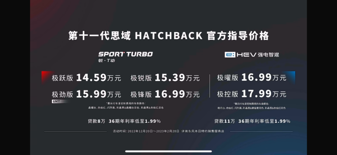 而昨日,东风本田11代思域两厢版同样也正式上市销售,新车与三厢版一样将会提供燃油版与混合动力两种车型,其中燃油版车型售价14.59-16.99万元,混动版售价16.99-17.99万元。