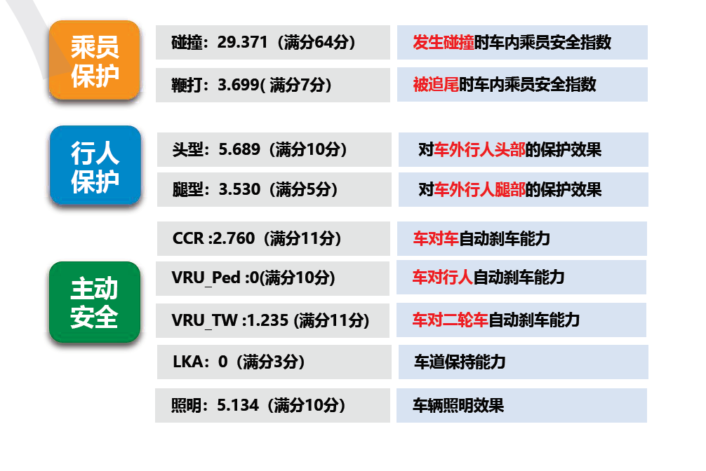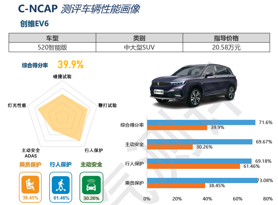 以它的价格以及配置而言,就算是放眼整个新能源车市场,这款创维EV的定位都并不算低,然而它无论是主被动安全性,还是行人保护,得分率都远低于平均水平。