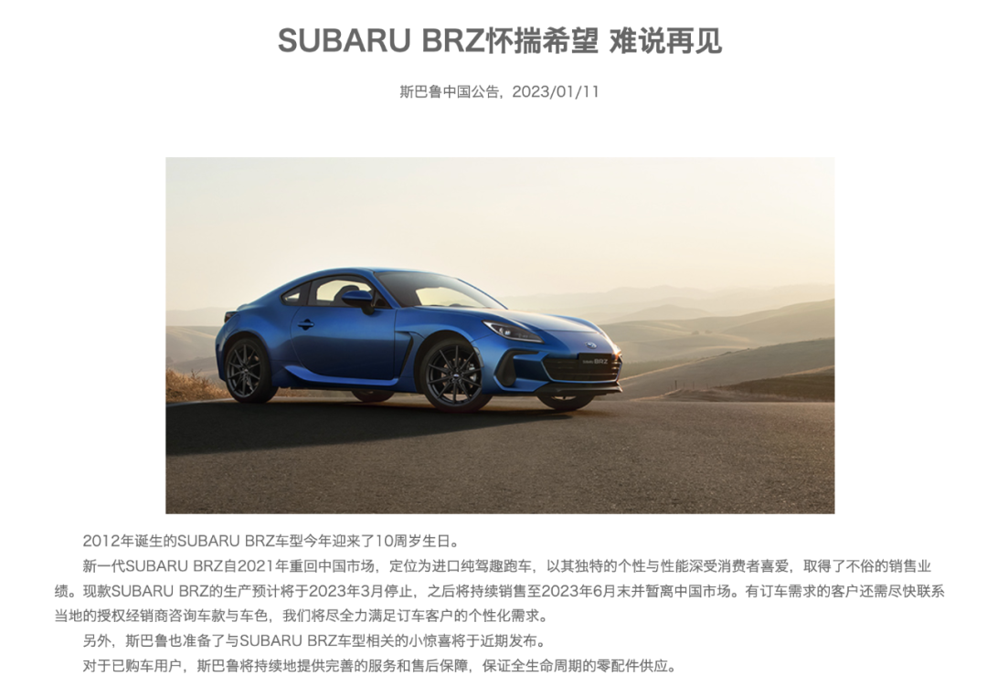 除了宝马以外,在今年稍早时候斯巴鲁也在官网宣布了BRZ车型将在3月份停产的信息,同时现款车型也只会销售到今年的6月底(也就是国6B实行的前夕)。换个角度想想,与这些因为无法满足排放法规而必须停产的车型相比,动力削弱是不是就显得不那么难以接受了?