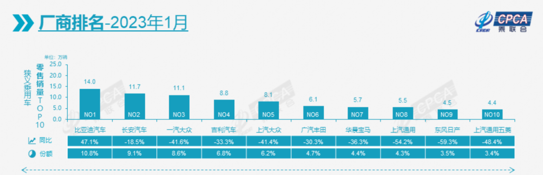 在厂商排名方面,比亚迪依旧是牢牢占据着国内车市的头把交椅,在市场整体疲软的情况下,比亚迪以超14万辆的零售量傲视群雄,并实现了同比47.1%的销量增幅,市场占有率也继续维持在10%以上。