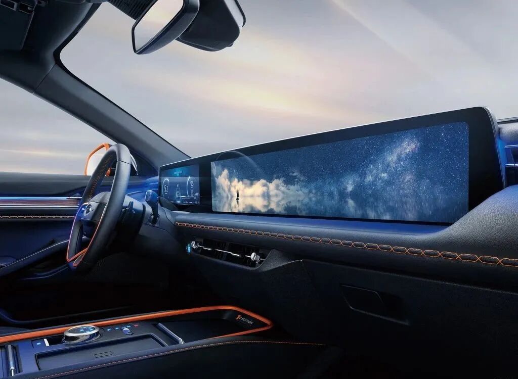 除了外观值得大谈特谈以外,EVOS这台新车的车厢内部亮点也是不少。首先是前排那个尺寸惊人的横向大屏幕,这个由12.3寸液晶仪表+27寸液晶屏幕组成的,总长达1.1米的巨屏能提供丰富的智能以及娱乐功能,好不好看、好不好用下回分解,这夸张的设计至少是博足了眼球,连新势力们都只能甘拜下风。