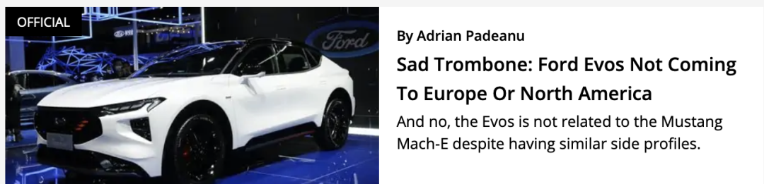 而根据福特的说法,EVOS将只会在中国市场发售,福特另外的两个主战场——北美与欧洲地区都暂时没有发售计划,这也令到国外不少媒体都感到失望,著名媒体Motor 1甚至用“哀号”来形容这一新闻,毕竟此前EVOS曾经在欧洲地区作过多次试验,同时它的实车颜值也确实是挺能打的。
