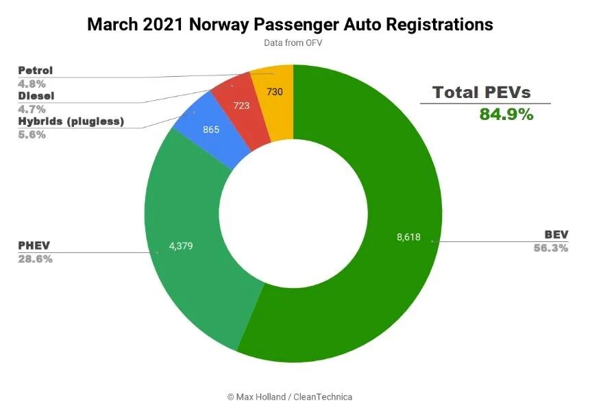 在种种利好的促进之下,挪威这个小国家在2020年一共卖出了76789辆纯电动车,占全部汽车销量的54.6%。而进入2021年,如果算上插电混动车型的话,挪威本土新能源车销量占比已经达到了惊人的84.9%。