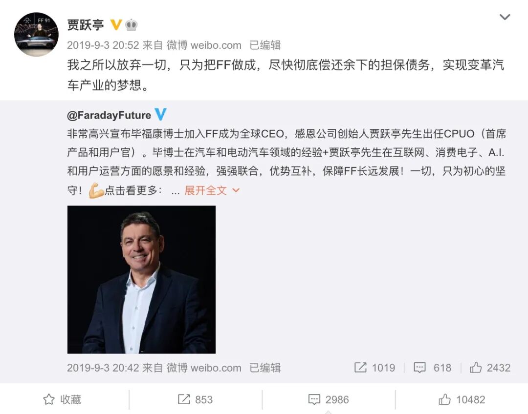 即便是深陷泥潭,贾跃亭也依旧没有放弃他的造车梦,毕竟尽管希望渺茫,但这也是他唯一一个可以证明自己的机会了。为了实现这个目标,又或者是为了让法拉第未来在国内能够顺利运作,贾跃亭甚至不惜早早辞去CEO的职位,转而找来了前宝马i8项目负责人毕福康接任CEO。