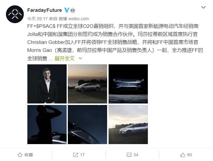 在四月份,法拉第未来更是在微博宣布,已经与包括美国Jolta、中国和谐新能源汽车控股有限公司(和谐集团)在内的两家销售合作伙伴签署了谅解备忘录,为车型后续采用直销(O2O)模式进行销售铺设好了渠道。