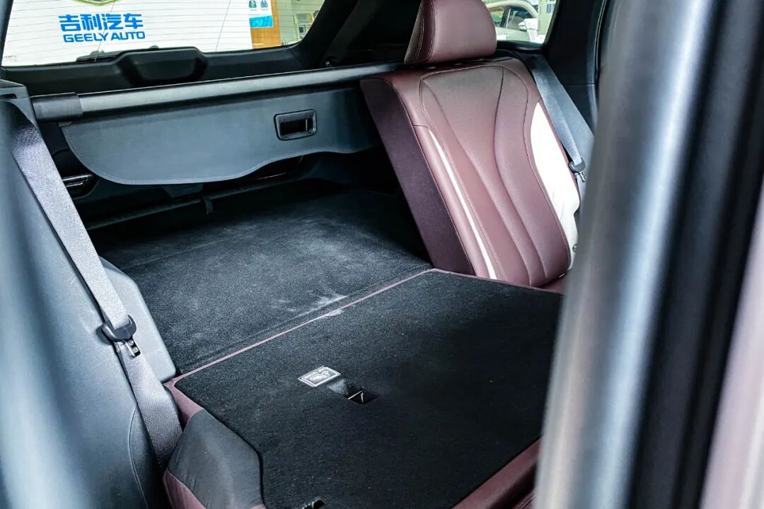 而五座布局除了能让后排乘客获得极其充裕的空间以外,对于尾厢的布置也是更加友好,虽然由于展车没有通电的原因我没法打开后备厢,但是从4/6分割的后排座椅中我们依旧能发现星越L的尾箱容积是一点都不小,更重要的是全平的地台设计能让尾厢与后排形成“大床”模式,为这台SUV增添了更多的“可能性”。