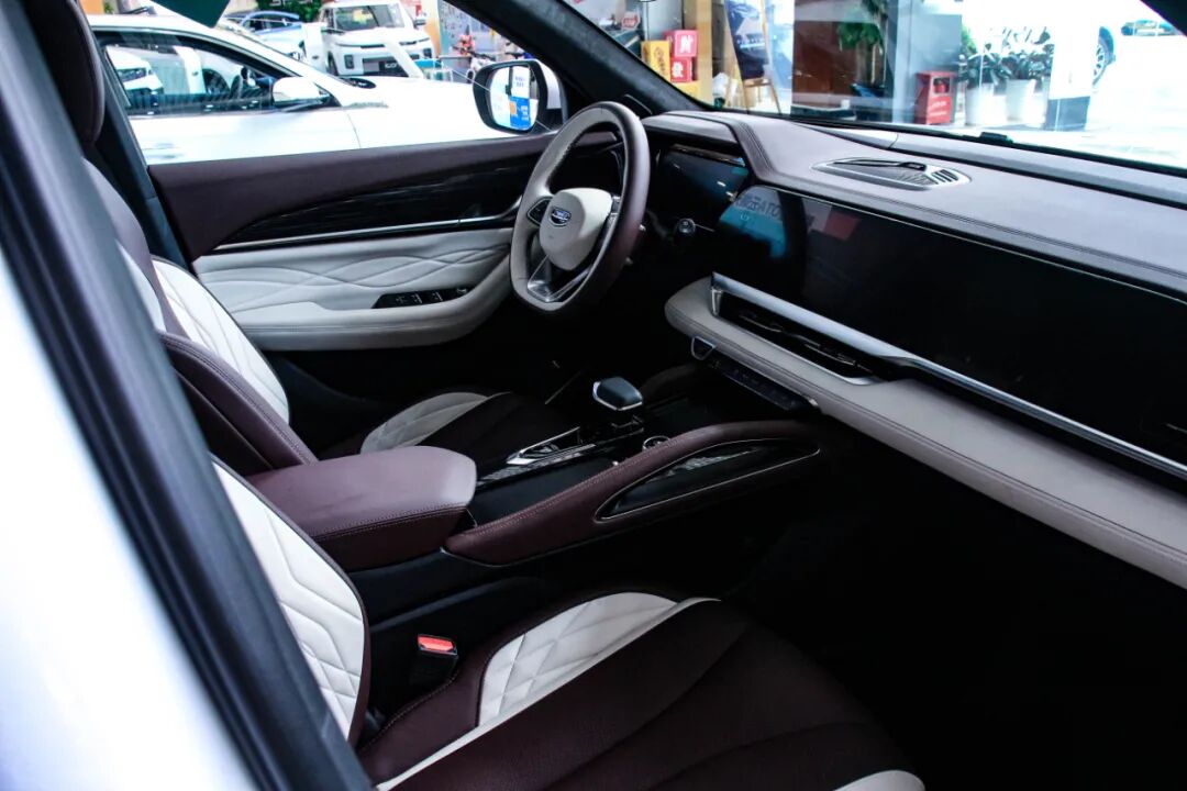 双色拼接的方向盘异常抢眼,这种以往在国外高端车型上才能看见的设计元素,如今在一台15万不到的自主品牌SUV上竟然一定都不显得违和。当然,整套内饰最抢眼的肯定就是中控台上那一整块的玻璃屏幕了。