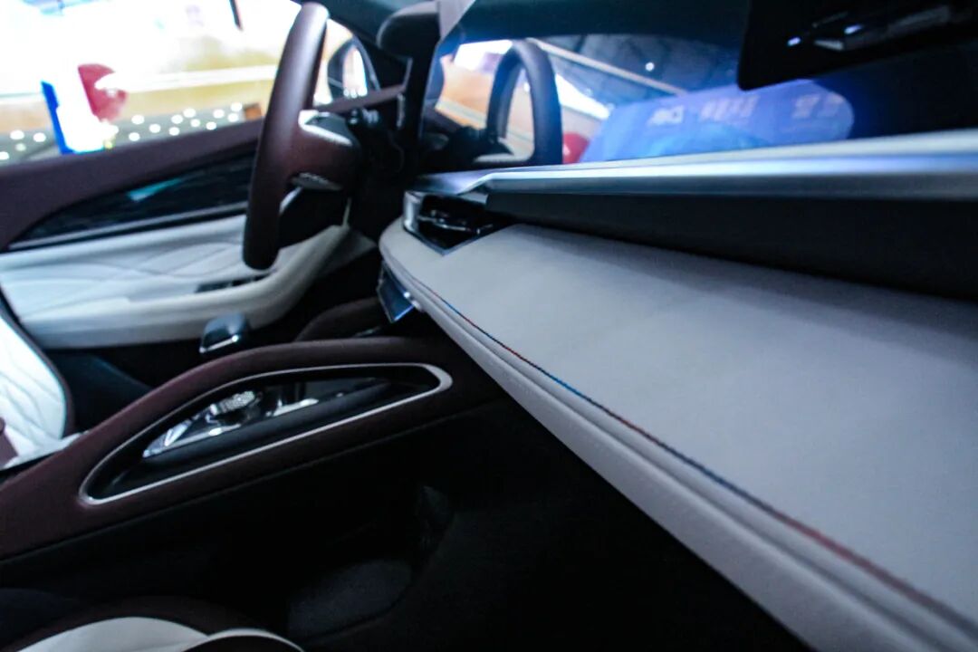 由于展车无法通电,我们也只能借用此前在上海车展上拍的照片来让大家一睹这块巨屏的风采了。随着所谓的“智能化”与“科技化”愈发被车厂所看重,我们也能看到越来越多的车型采用这种激进的屏幕设计,像是在大家都熟悉的理想ONE以及奔驰此前发布的EQS上,我们都能看到类似的横向大屏。
