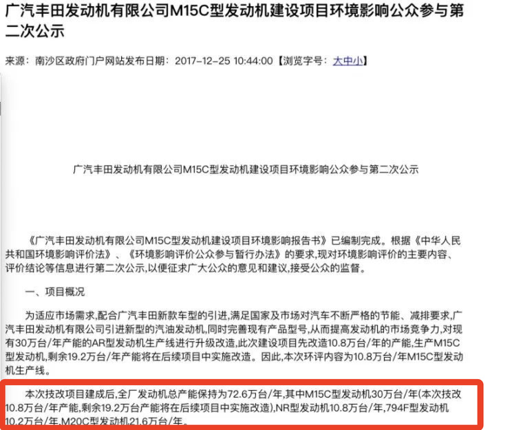 其实,早在去年的3月份,一份关于丰田M15C发动机即将在广州南沙工厂投产的公示就已经在网上疯传了,里面提到了这台三缸发动机在日后将会将产能提高到30万台/年,换言之它成为丰田未来的主力机器早已是板上钉钉的事。