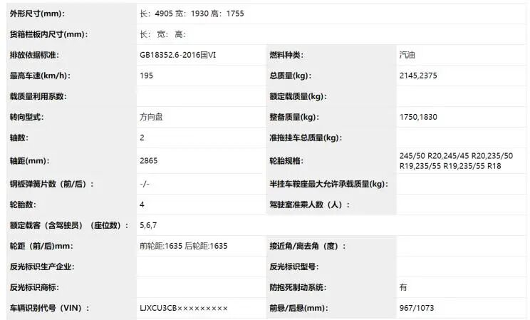 从申报信息上来看,这台新车确实是一个“大块头”,1930mm的车宽与1755mm的车身高度足以让它成为停车位杀手,同时,有着2865mm轴距的它还将会提供五座、六座以及七座等多种座椅布局。