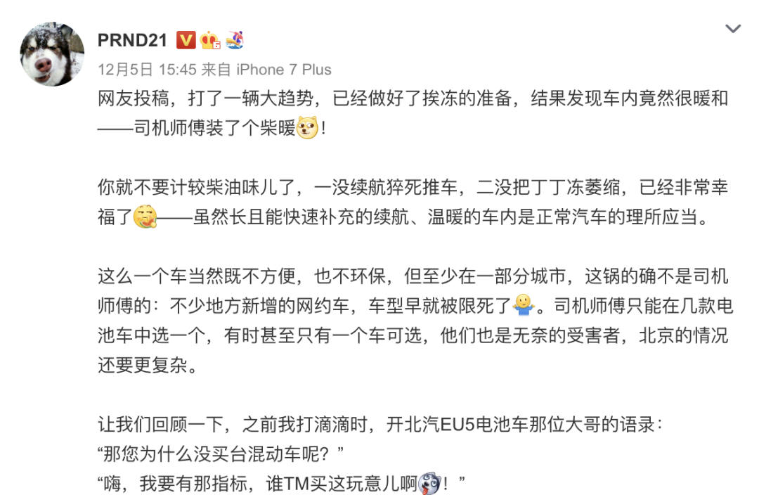 由于冬季低温,电池性能下降,在北方有不少新能源车车主连暖气都不敢开,为了能够保证车内的温度,甚至只能无奈地在车上安装柴暖机,通过烧柴油的方式来为车辆提供暖气来源。