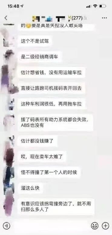 据说,这次事故并非4S店带客户试驾,而是4S店为了省钱,让员工开着无牌无保险,且拔掉了ABS传感器的新车进行区域“调货”所引起的。