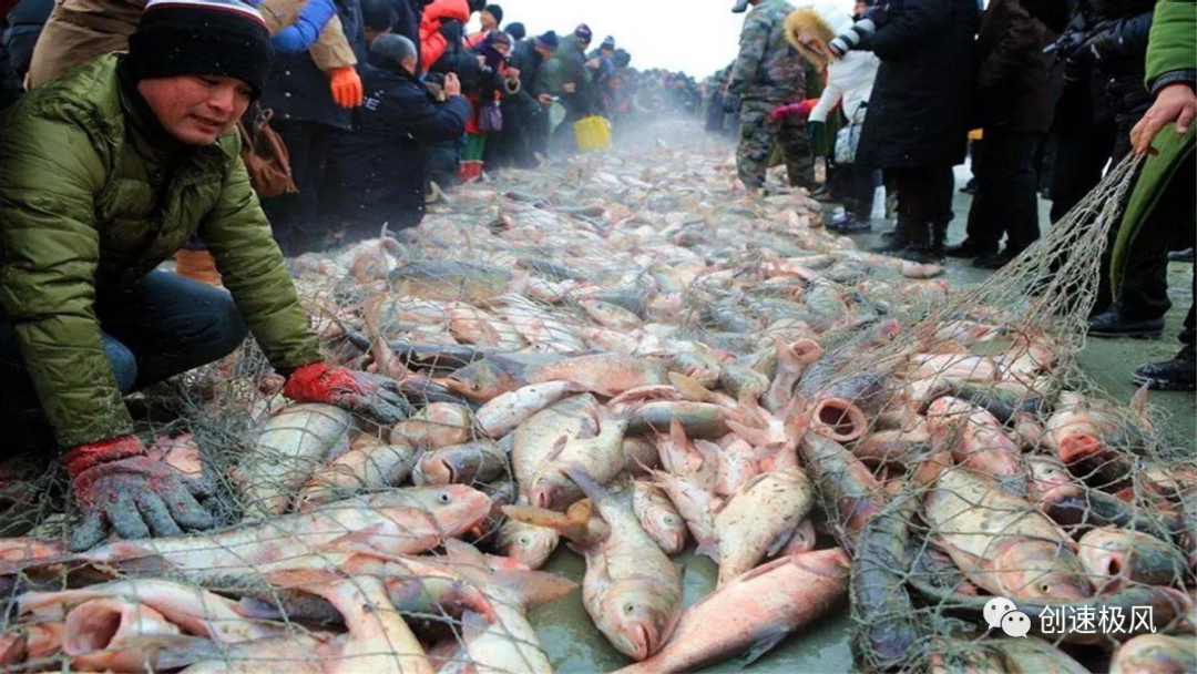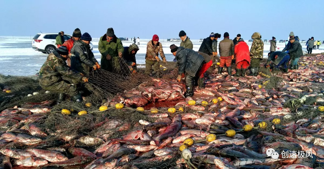 一般来说,一个养殖户的鱼塘,如果只补鱼苗,完全粗放养殖,不喂任何人工饲料,那么每亩水面一年大概可以产鱼15公斤。而如果投喂饲料半精养,每亩水面年产可以达到400公斤,最多可以达到年产1000公斤。这里我们就用最低标准15公斤来计算,可以发现,即使如此,查干湖大鱼每年的自然增长量也高达517,500×15=7,762,500公斤。776万公斤相当于7760吨,也就是说查干湖每年光是自然生长出来的鱼至少就有7700多吨。