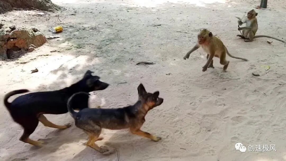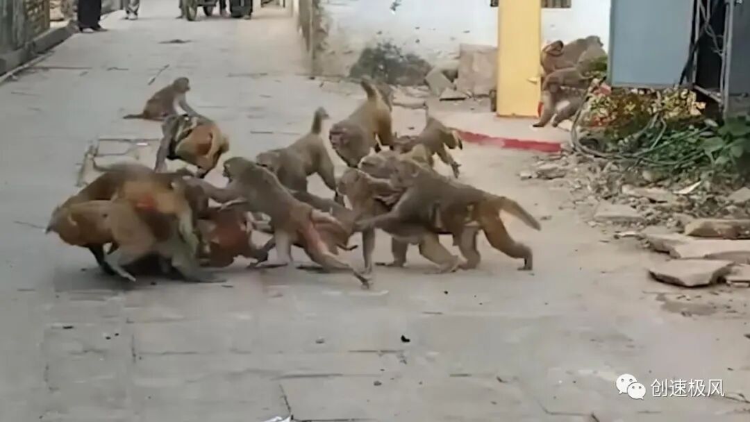 这场“猴狗大战”发生在印度马哈拉施特拉邦的一个村庄里,当地村民亲眼目睹了大战的全过程。双方大战的导火索其实是,一只母猴带着幼崽在村里玩耍时,突然被几条大狗盯上。它们分工合作,一队缠住母猴,另一队则趁机咬死了小猴子。伤心的母猴回到猴群后,立刻向猴王告状,为了维护猴群的面子和地位,猴王带领着成员们开启了一场浩浩荡荡的复仇行动。它们在极短的时间里迅速占领了村庄的各个角落,并结伴抢劫狗窝里的幼崽。