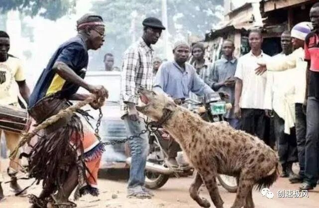 在南非的尼日利亚街头,就有一群专门训练鬣狗杂耍的驯兽师。他们牵着鬣狗在集市上表演一些看似简单,实则极其疯狂的杂技技巧,比如:背着鬣狗表演托马斯转圈、骑着鬣狗赛跑、让它们直立跳舞等。但是每位驯兽师在表演过程中,都会紧紧攥着手里的铁链,因为稍不注意就可能会发生意外。那这些驯兽师是如何驯服鬣狗的呢?第一步就是抓捕。由于鬣狗的寿命平均只有12岁,所以驯兽师想要获得属于自己的野兽,只能冒险去野外抓捕。通常他们选择的训练目标是鬣狗幼崽和地位低下的雄性鬣狗,抓回来后就用链子拴上。驯兽师会和鬣狗同吃同住,慢慢培养感情、建立默契,然后再教导它们一些杂技技巧。