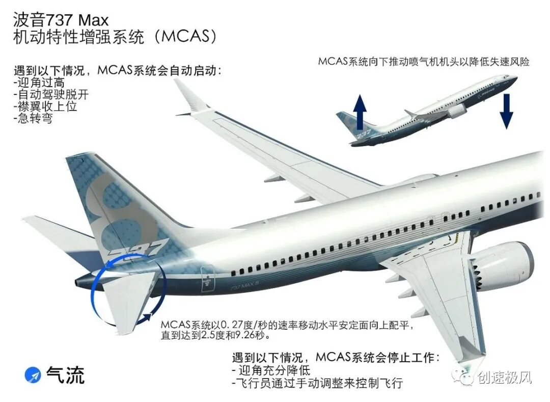 MCAS(机动特性增强系统)是波音737MAX特有的系统。因为737MAX的发动机比普通飞机更大需要的空间也更多,而改变了飞机的气动外形,导致飞机在飞行过程中更容易失速。而MCAS的存在就是弥补这个Bug,它能在检测到飞机有失速的风险时自动介入操作,下压机头,避免飞机失速。