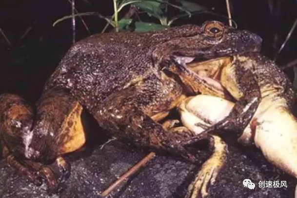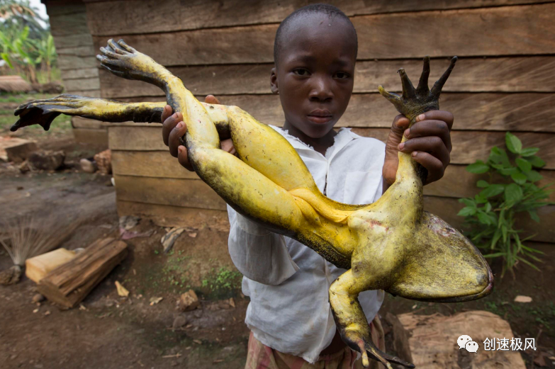 不过随着物价上涨,牛蛙的价格也越来越贵,餐厅里基本都要卖到60元/公斤。就在我们一边心疼钱,一边大口嗦着牛蛙的时候,非洲人已经把目光放到了捕捞巨型蛙身上。在非洲喀麦隆南部热带森林的溪流中,栖息着一种“巨无霸”蛙。这种巨蛙的学名叫做非洲巨蛙,当地人也称它为歌利亚蛙。成年非洲巨蛙的体重可达3公斤,展开后腿长度超过了1米。