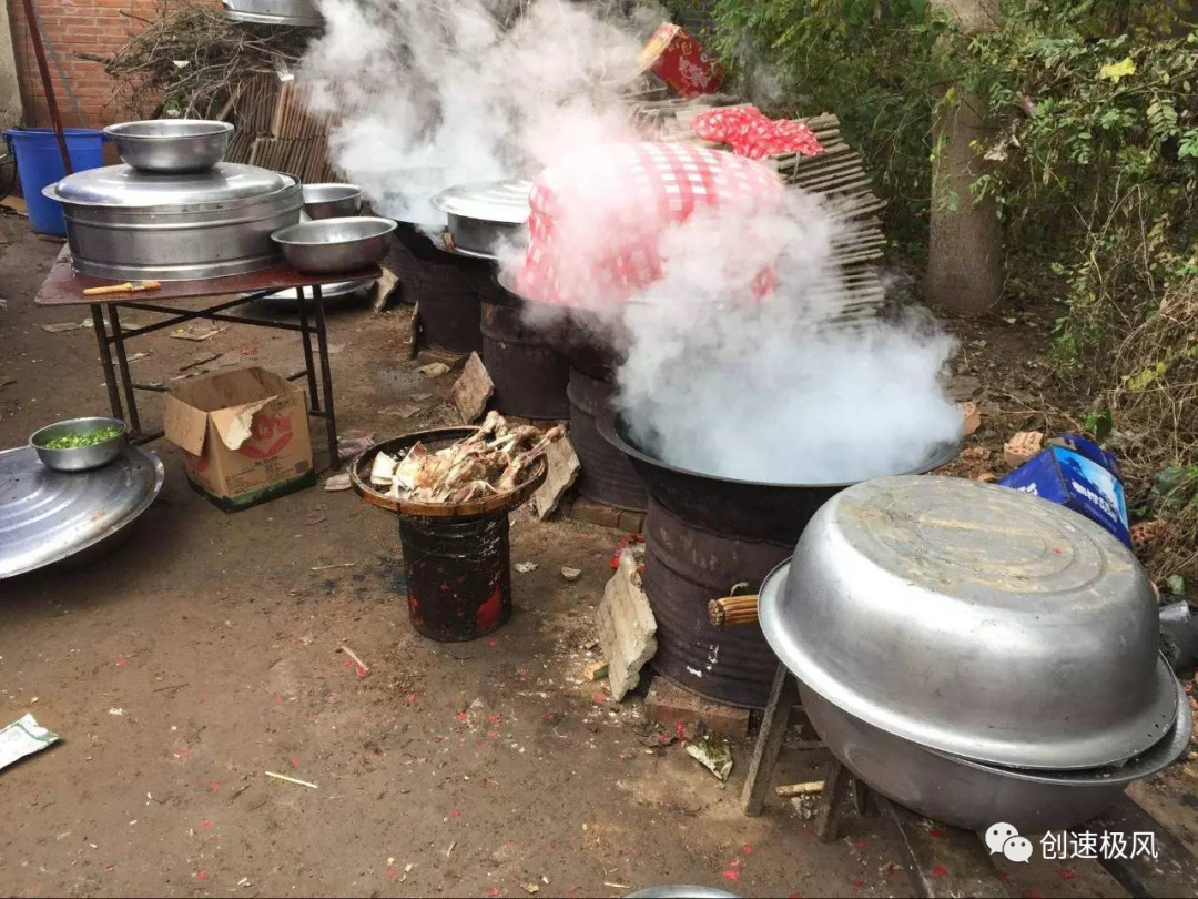 最重要的是,农村来往走动的亲戚偏多,每次参加宴席的人也多达几百人,自己居住的房屋就需要腾出很大的地方,来让厨师发挥。有时为了方便,直接在门口搭个棚,借来大型的蒸锅和炒锅,就开始烟熏火燎的做饭之旅。