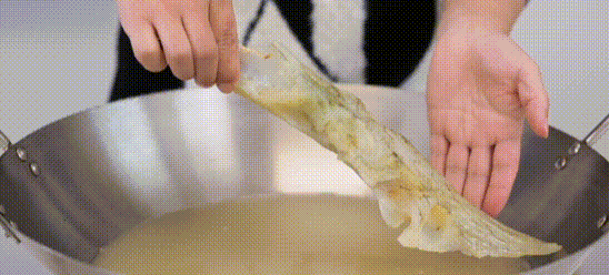 之后要用牛骨、羊骨、鹿骨、驴骨、甲鱼骨、飞龙骨(一般指哺乳动物的骨头,可能是猪骨)、乌鸡骨和鹌鹑骨这9种骨头熬制浓汤,这一步和开水白菜也有着异曲同工之处。 熬出来的浓汤将油脂过滤后,只需要加入适当的盐,就可以将鱼骨放进去小火煨煮2个小时。在这个过程中,原本坚硬的鱼骨会逐渐变软,吸满汤汁,看起来就像是脆骨一样,只不过口感更加软糯。
