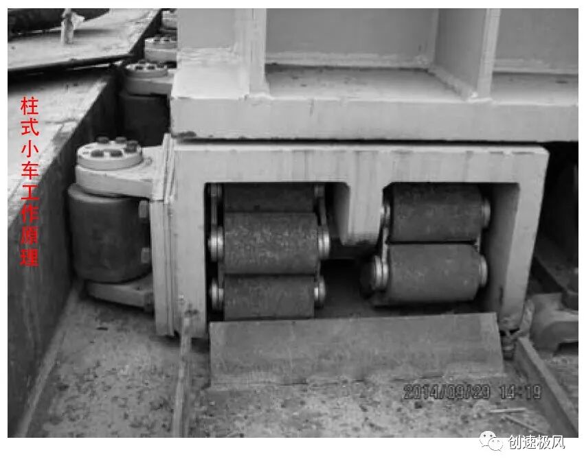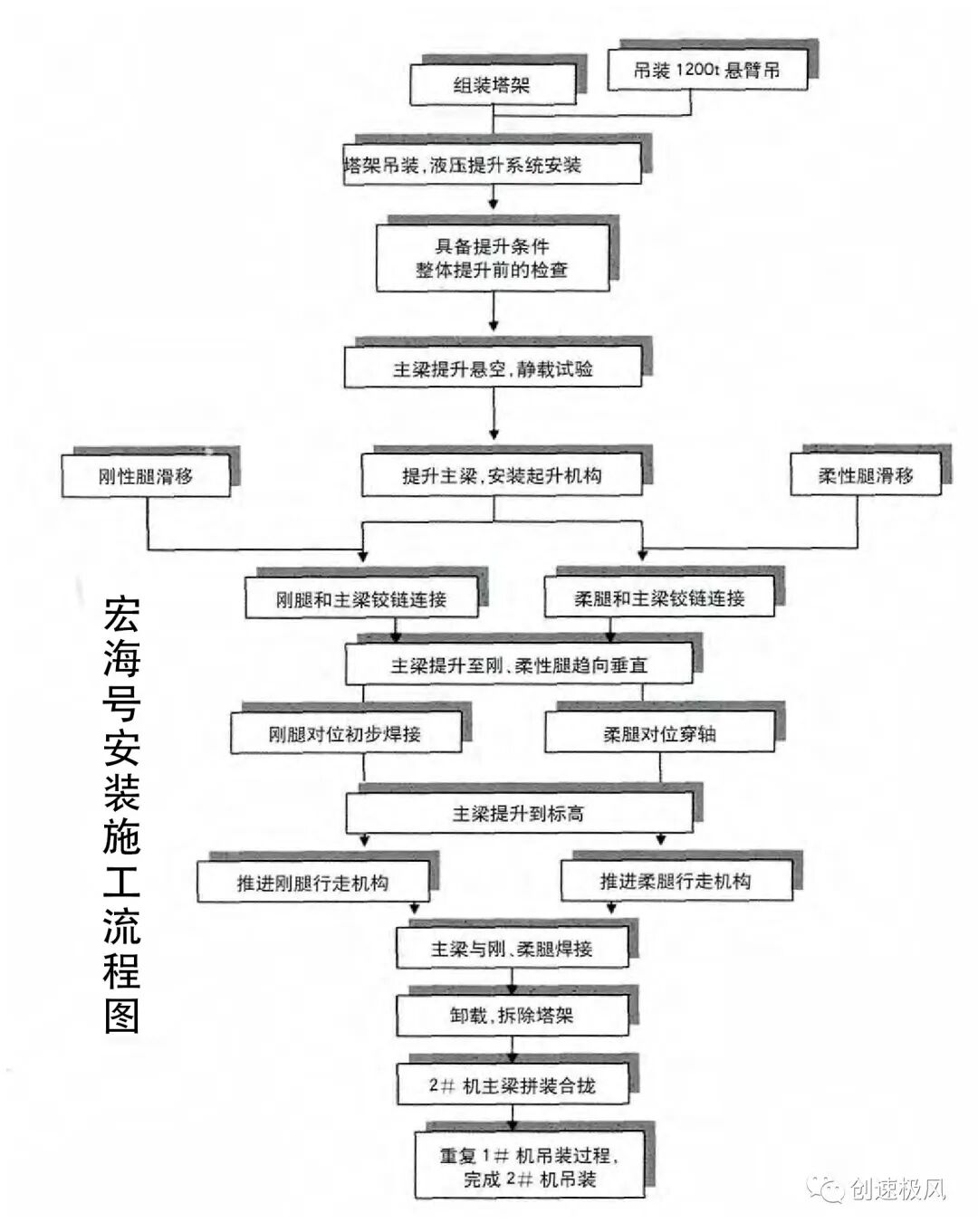在总体设计上,“宏海号”的设计和建设难度成倍增长。其行程为300米,支腿平衡梁长48米,运行机构长度合适。故而摒弃了“泰山号”所用的滑动摩擦,转用滚动摩擦形式的支承系统。采用占地面积小,摩擦因数小,安装简便的滚柱式小车。 同时,摒弃了传统采用的液压缸驱动,采用齿轮齿条传动。通过齿轮与齿条的啮合,带动横梁间的移动。使龙吊门整体的传动更加刚性,保证两侧同步移动。