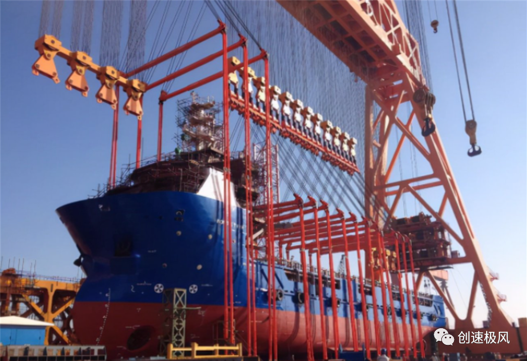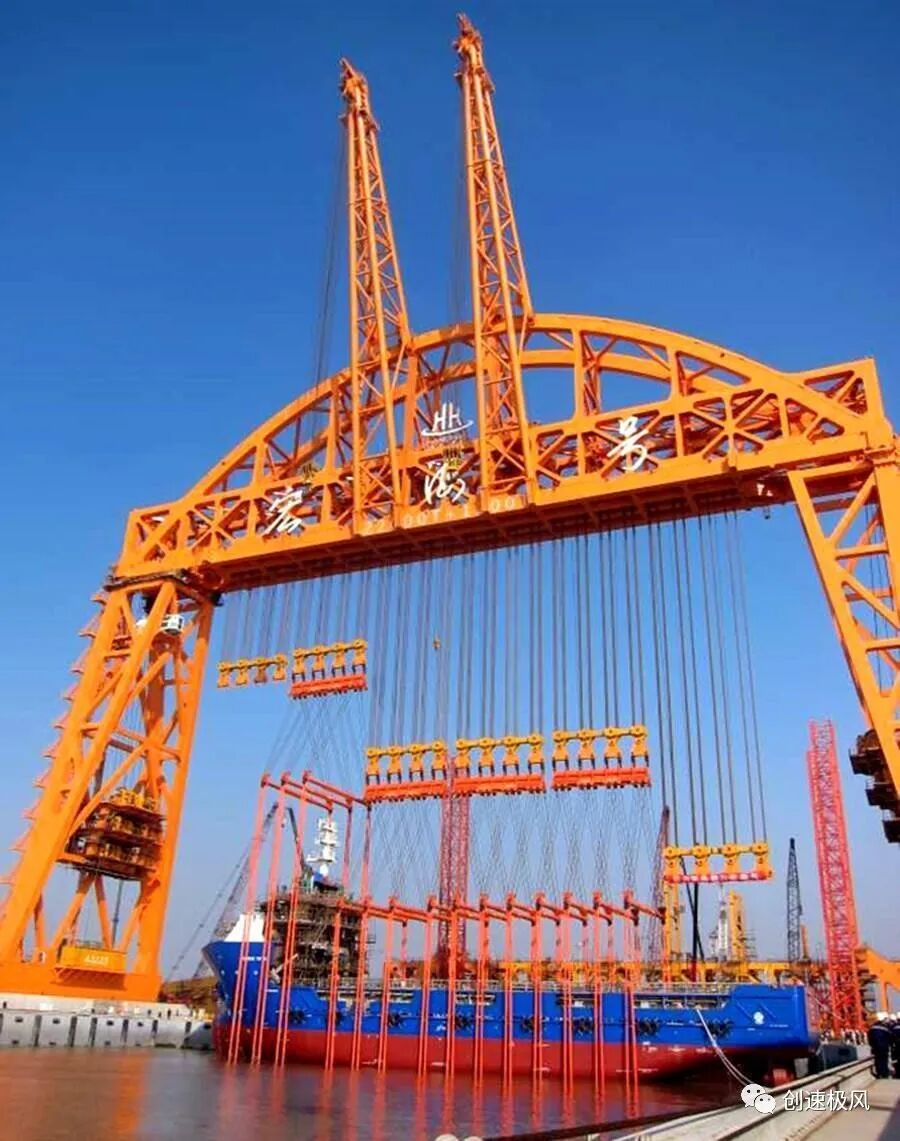 “泰山号”由高主梁和低主梁组成。主梁自重4000吨,载荷105KN。但宽度只有4.6米,两端能承载7000吨的重量。因为载荷巨大,工程师们特地为它选择了耐磨、耐压的滑动摩擦形式运行支承。为了减小摩擦因素,选用改性聚四氟乙烯板。该材料摩擦因数仅为0.04,工作温度为-20℃-250℃,什么极端天气都可以正常作业。 “泰山号”总投资3.5亿,克服了极端天气、复杂地形等问题,具有负载强、稳定性好的特定。被风吹倒,砸到航母的情况,目前为止,没有出现过。在很长的一段时间内,“泰山号”是龙吊门的巅峰。直到2014年“宏海号”横空出世,刷新了世界之最的记录。