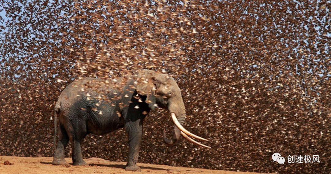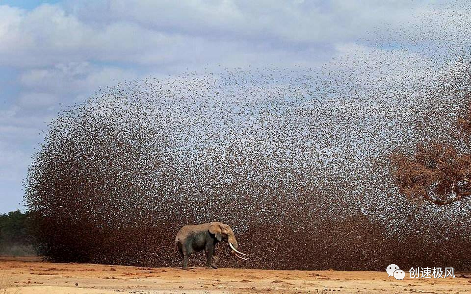 非洲肯尼亚地区,一位摄影师拍下了这样的画面,一个象群正在草原上觅食,突然头顶一黑,密密麻麻的麻雀就朝着它们袭来。大象笨拙的举起鼻子,想要保护自己,但麻雀已经肆无忌惮的对它们发起了攻击。为首的大象瞬间被包围,除了叽叽喳喳的吵闹声,就只能看到大象的四只脚露在外面,慌乱的寻找出口,嘴里还不时发出呜咽,似乎是在求饶。可麻雀仿佛觉得不过瘾,再次伸出红红的嘴巴,朝大象身上啄去。