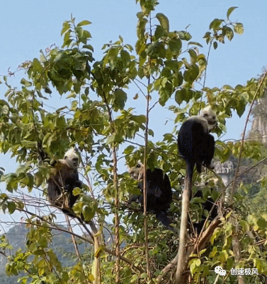 到了黄昏的时候,白头叶猴们会随着太阳落山的脚步,成群结队离开树丛,化身“攀岩高手”,在无比陡峭的悬崖绝壁上健步如飞,接连回到家族集体休息的地方。