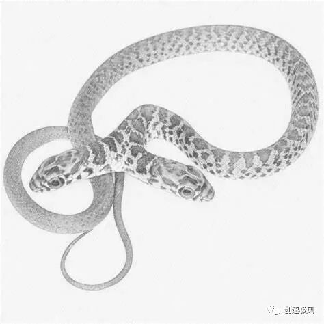 事实上,双头蛇确实是存在的,它只是长得怪异,但并不恐怖。过去人们没有相机,也无法记录双头蛇的图片资料。目前世界上现存最早的双头蛇图片,是1927年7月23日拍摄于河北唐山岳各庄的一张黑白照片。由于这张照片发布于民国时期最有名的《北洋画报》上,因此当时还引起了一番轰动,大街小巷都在谈论这桩奇闻。如今这张照片还保存在南京图书馆,大家有兴趣的也可以去看看。现在我们所说的双头蛇,一般指的就是颈部分叉并且拥有两个头的蛇。在古代,双头蛇还被称作越王蛇、两头蛇、枳首蛇。双头蛇并不是某个罕见的物种,而是发生基因突变的蛇。