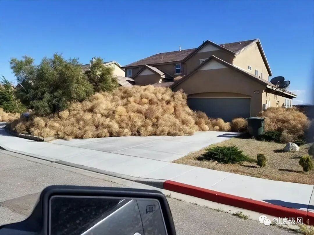 首先,风滚草严重地影响了居民们的正常生活和生命安全。风滚草随风滚动,并且好多个会在一起包裹成团,越裹越大,房子有多高,它们就可以堆得有多高,美国居民早上一打开门惊呆了,家门都被封死了。所以它们淹没小轿车那更是分分钟的事情了。