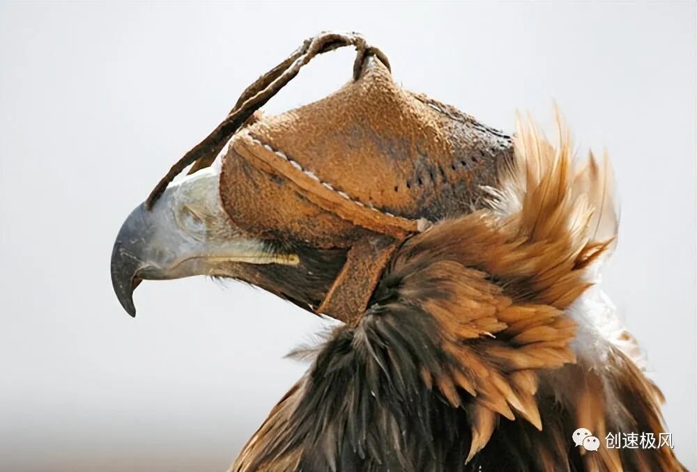 在赶路的时候,驯鹰人不会取下金雕的眼罩,也可以说从熬鹰开始,这个熟牛皮眼罩就会一直戴在金雕头上。除非是家养很久的金雕,不然就只有到捕猎的时候才会取下来。
