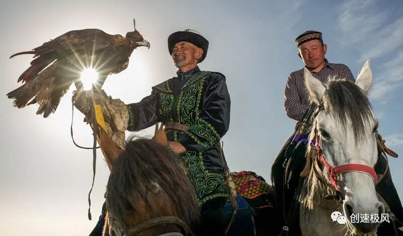 驯鹰人结伴出门捕猎的时候,只需要骑着马架着金雕就足够了。金雕不是宠物,在出远门的时候,驯鹰人是绝不会把它们装在笼子里的。